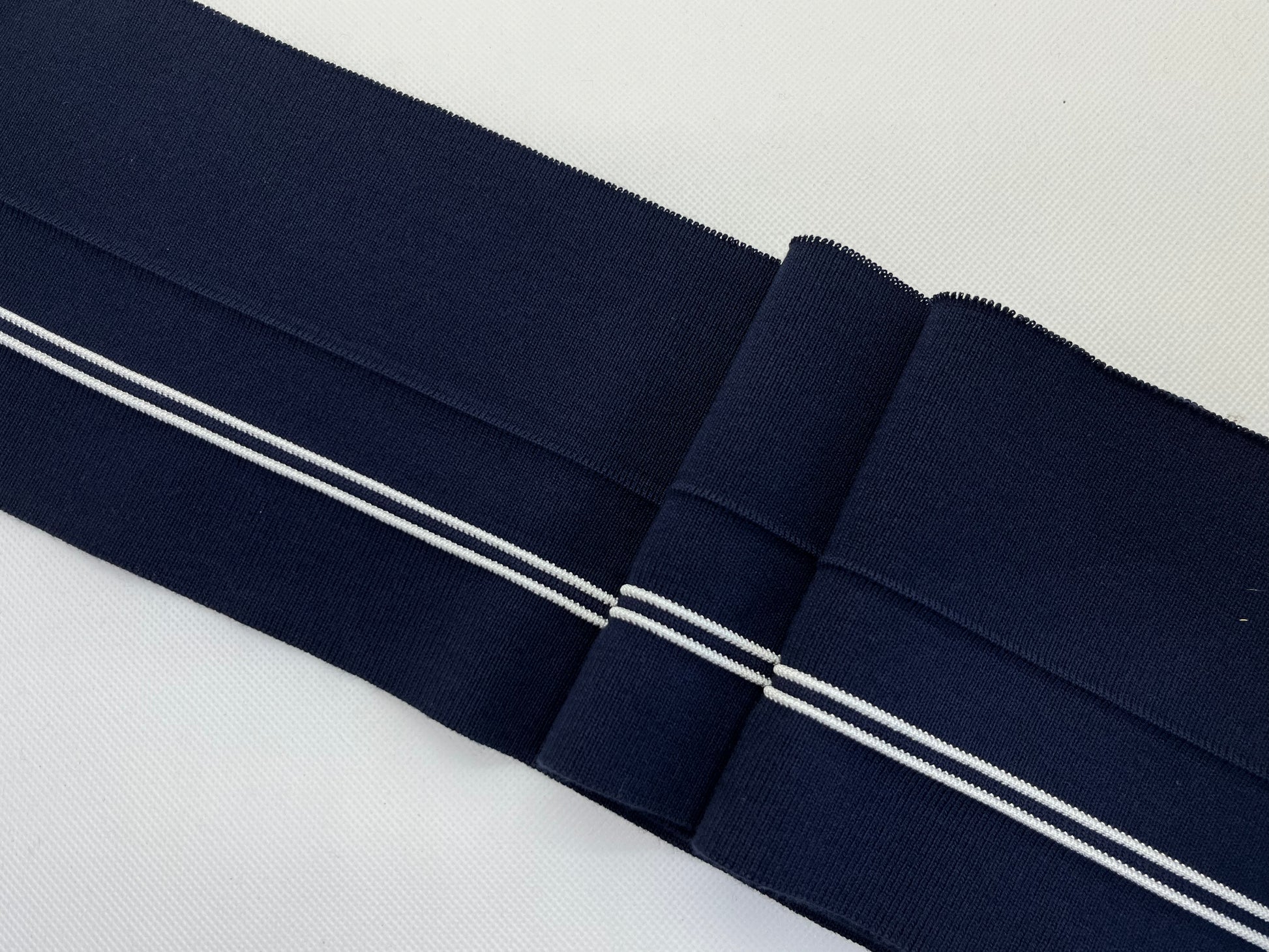Le bord-côte Bleu marine avec une rayure en relief blanche est confectionné avec différents matériaux de qualité supérieure. Il offre une finition élégante et durable pour vos projets de tricot ou de couture. MADE IN FRANCE.