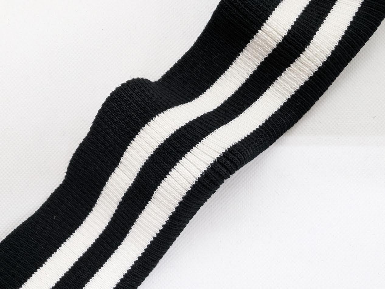 Bord-côte rayé noir et blanc en coton et élasthanne, en côte 2/1, de très belle qualité, avec une cassure. Idéal pour confectionner des poignets.