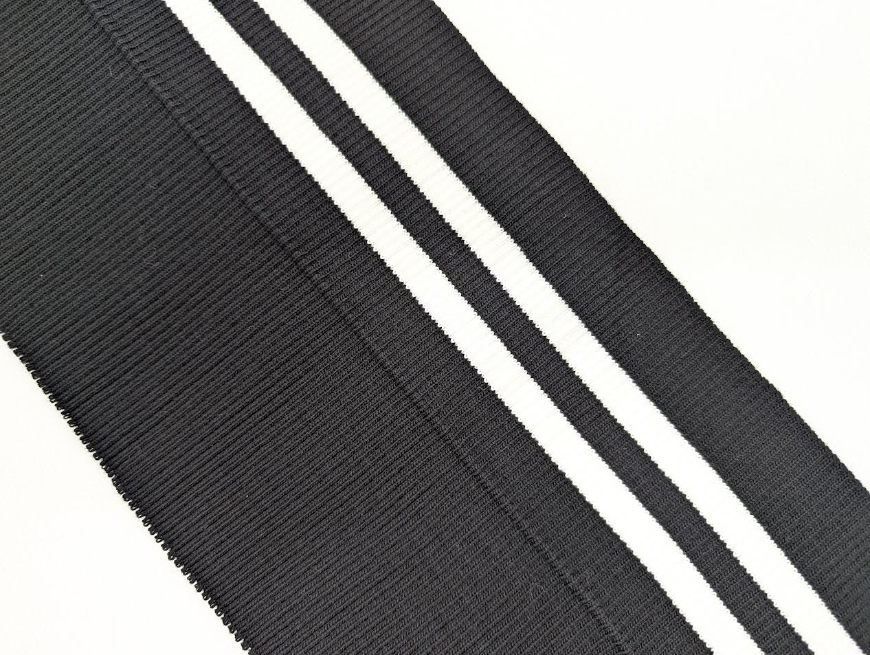 Bord-côte en coton et élasthanne, en côte 2/1, sur fond noir avec deux belles rayures blanches, la première à 2cm de la cassure. Très belle qualité. Ce bord-côte sera parfait pour confectionner des poignets de teddy.